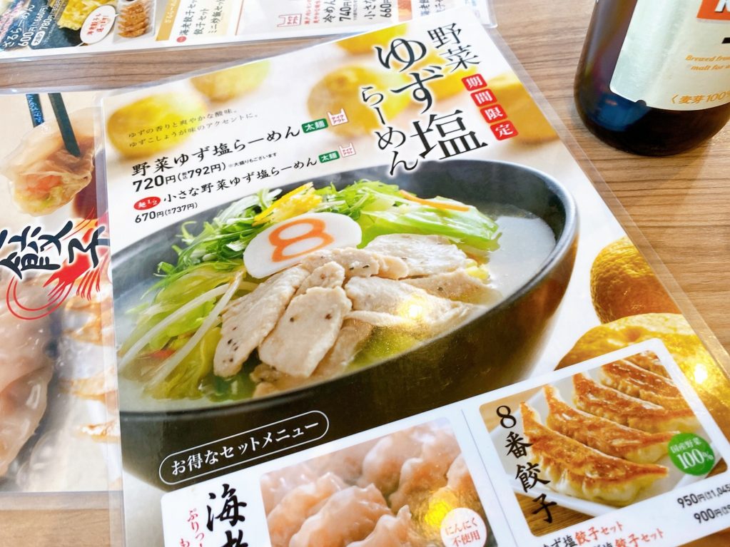 8番らーめんの「野菜ゆず塩ラーメン」を食べてきた。4月1日(木)~5月中旬頃(予定)の季節限定メニューだな。