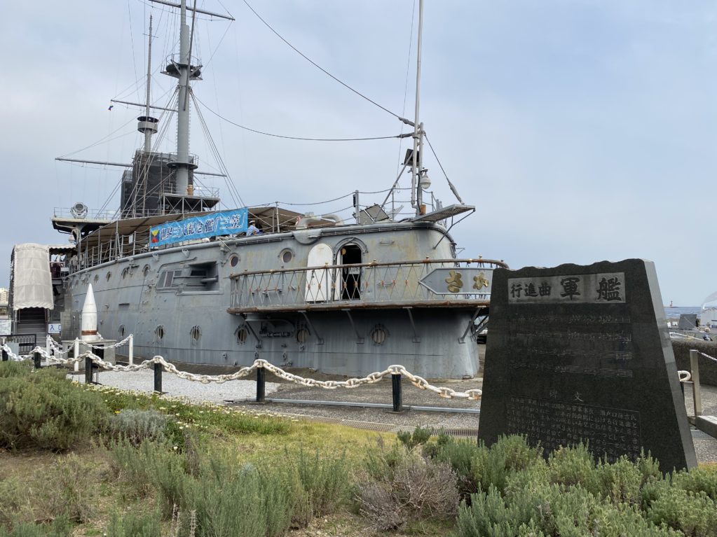 しばらく歩くと見えてきた戦艦三笠。日露戦争のときに大活躍した船だ。
