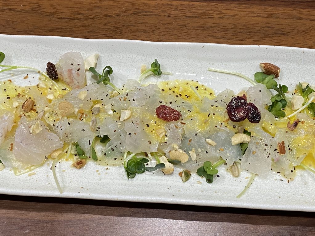 で、合わせたのは鯛の刺身。カルパッチョやね。ナッツも散らしてみた。