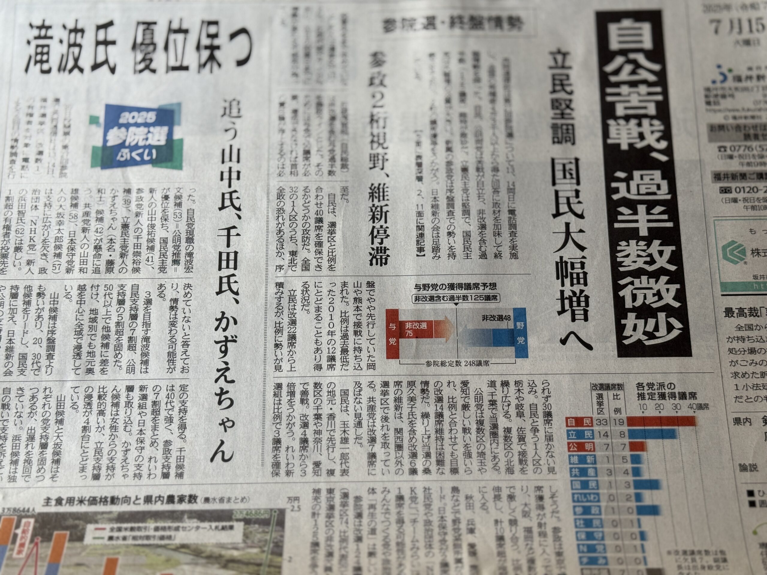 参院選、福井選挙区の終盤情勢が出てきた。あかんわ。なんで自民に入れるんやろ。。