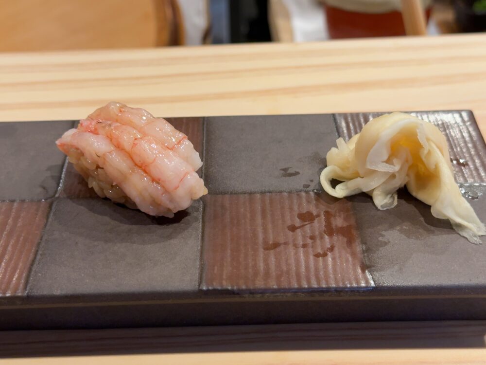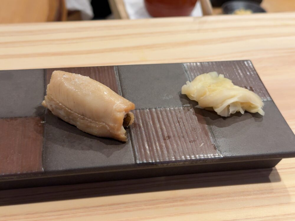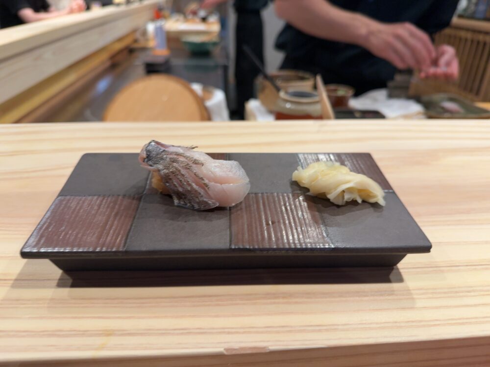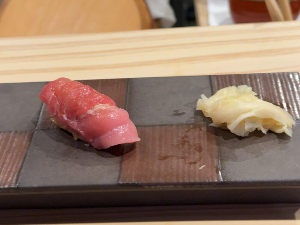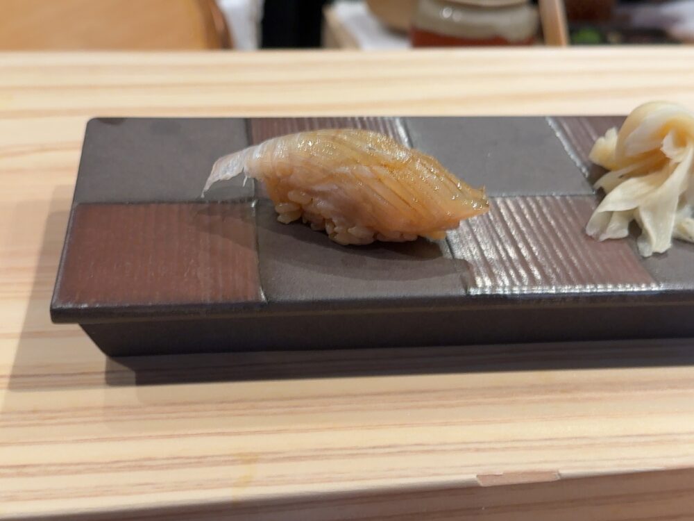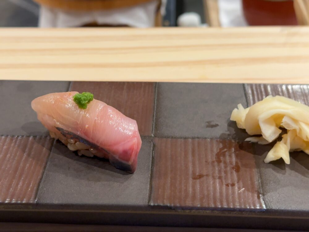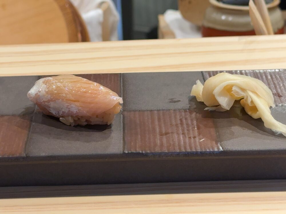 カンパチのトロ。個人的にはこれが今日の優勝だ。ラビットさんが言ってたが脂の強い魚だと強めの酢がバッチリ合って相性が良くなる。それは確かにそうかも。
