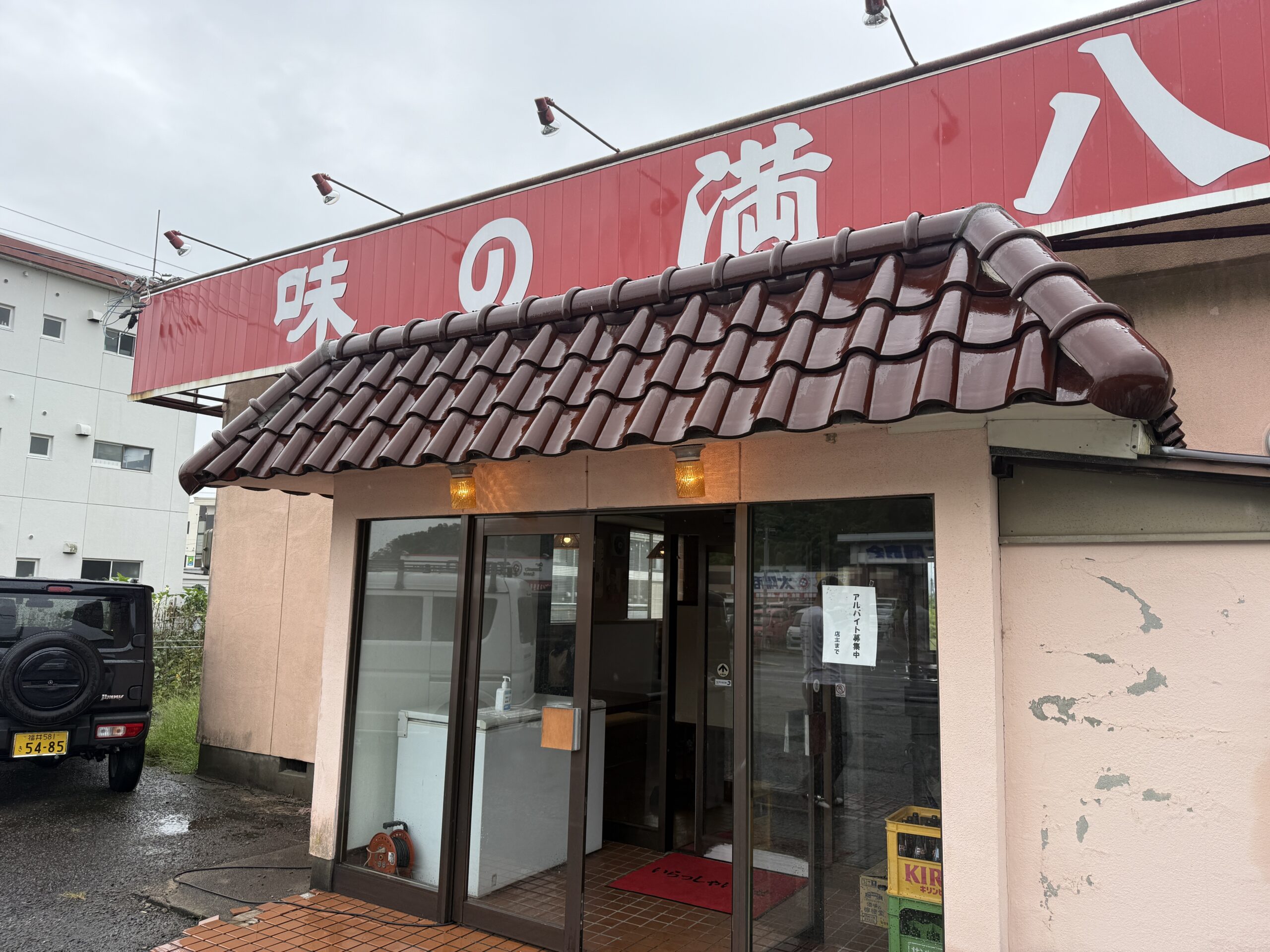 この店の前は何度も通ったことがあるが入ったことはない。そもそも何の店かもわからないよな。看板も「味の満八」と書いてあるだけでどんなジャンルのレストランかわからない。ショーウインドウとかも特にないし肉屋さんの可能性すらある印象だ。ちょっと廃墟っぽい雰囲気もあるし。。