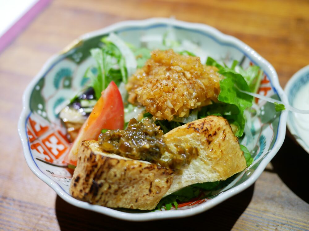 ということで、まずはサラダ。揚げ茄子と厚揚げが入っていて、もろみみそ?と大根?玉ねぎ?の刻んだの?が乗ってる。よくわからんかった。なんかバルサミコ酢の味もするような。