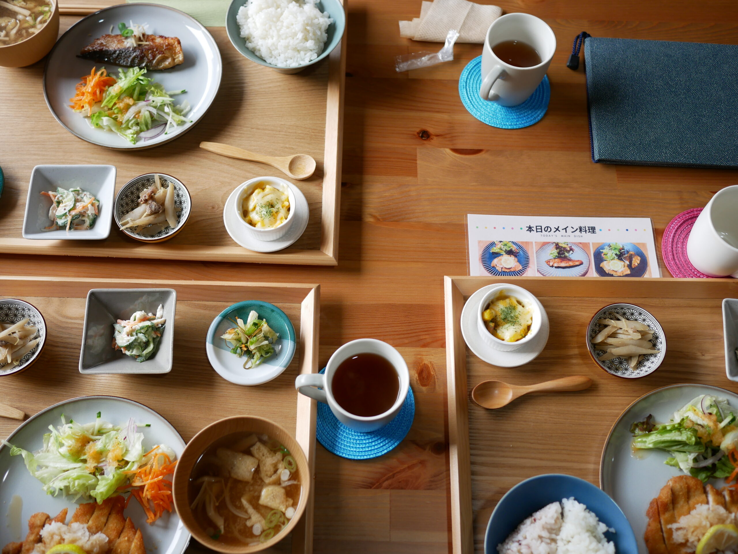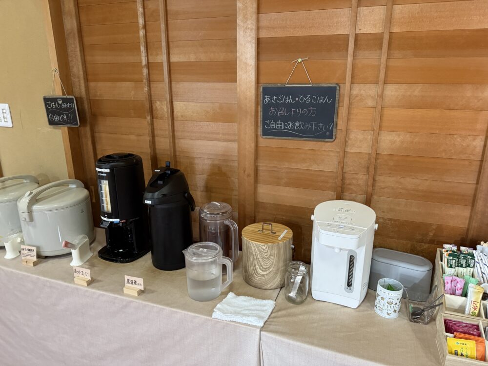 ご飯と飲み物は自分で取りに行くルール。お代わり自由。白ご飯と十六雑穀米、黒豆茶、コーヒー、いろんなティーバッグなどがあった。