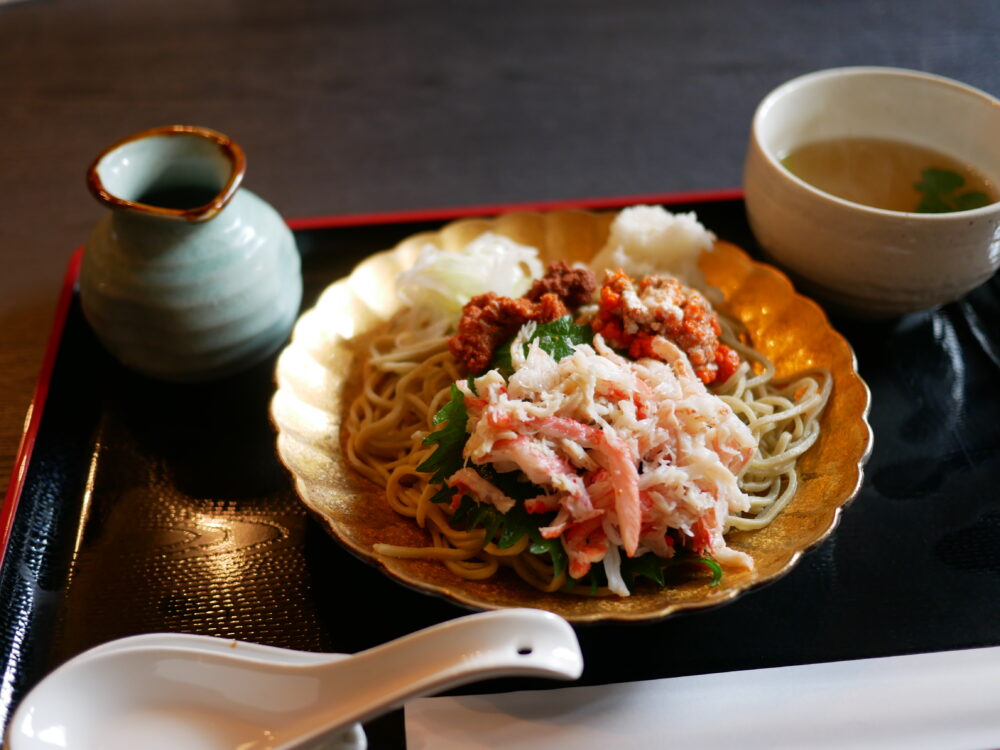 さて、しばらく待ってやってきたそのカニ蕎麦。カニ出汁のスープが付いてる。
